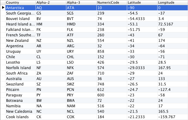 今回は、実際にMySQLからRへのデータを取得して、表とプロットしてみることにします。 利用したデータは、socrataのサイトで公開されている 国名と代表点の経緯度のオープンデータを利用してみました。 まず、事前にMySQLのテーブルとしてデータを登録してあるところからはじめることにします。