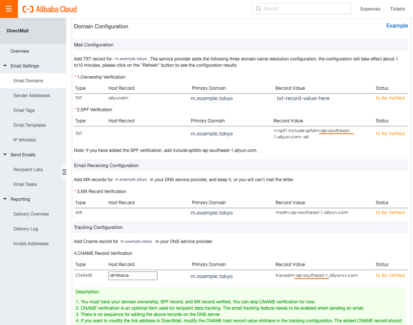 なお、3つのリージョンでDirectMailのサービスは提供されていますが、杭州リージョンで利用するためには個人認証が要求されます。 今回は個人認証の情報登録が不要なシンガポールリージョンを利用しました。