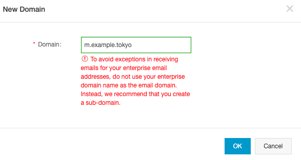 登録の際には、会社のドメインではなくサブドメインを作成することを推奨しますとの注意書きが表示されていたので、