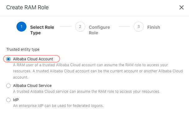 他のAlibaba CloudのRAMユーザーからのアクセスを引き受けるためのRoleになるため、Alibaba Cloud Accountを選択します。