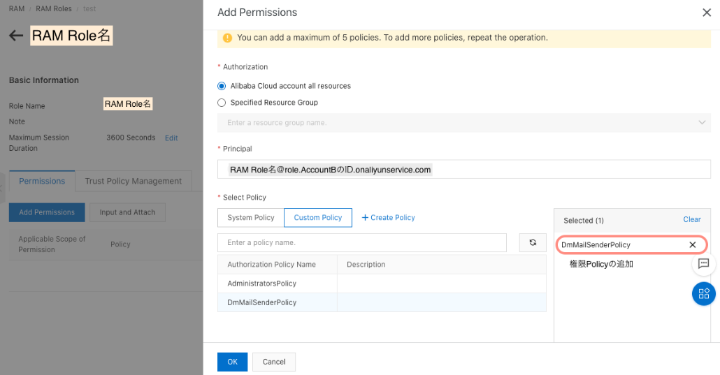 ここで アカウントB にて設定したRAM Roleの名前とAlibaba Account IDを入力します。