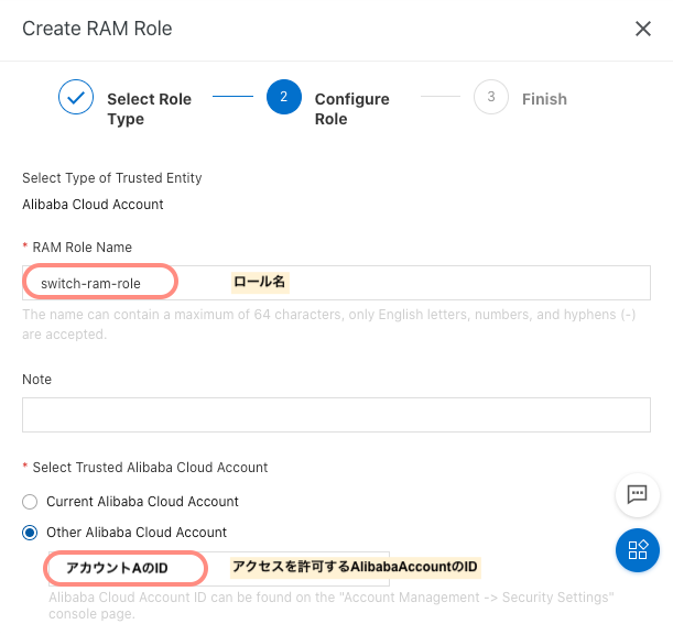次にRAM Roleの名前とアクセスを許可する Alibaba Account ID を指定します。