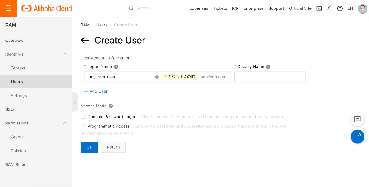 今回は、Alibaba Account IDにはアカウントAのIDを指定します。