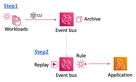 Step1では、テストデータの登録のためにカスタムEventbusにArchivesを設定し、テスト用のワークロードをCLIを用いて登録して登録します。