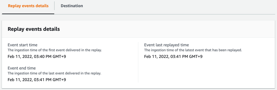 実行ソースとなるEventBusやイベントを再実行する対象時間を指定して再実行します。AWSコンソール画面でも直感的に理解できると思います。