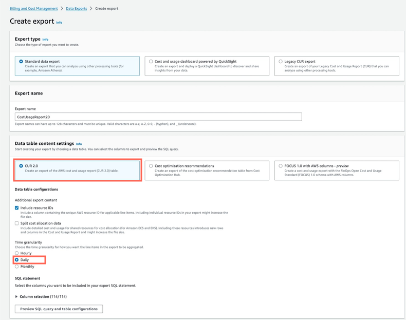 列数が114もあるため、詳細はAWSのドキュメントを参考にしてカラムの情報を確認してください。Map型のカラムが定義されているなど、データ型もLegacy CURからは変更点がありそうです。