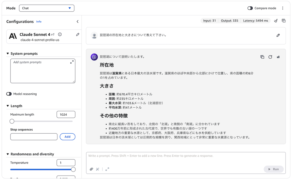 プレイグラウンドの画面で、Application InferenceProfileを指定して実行してみると無事に呼び出しができました。